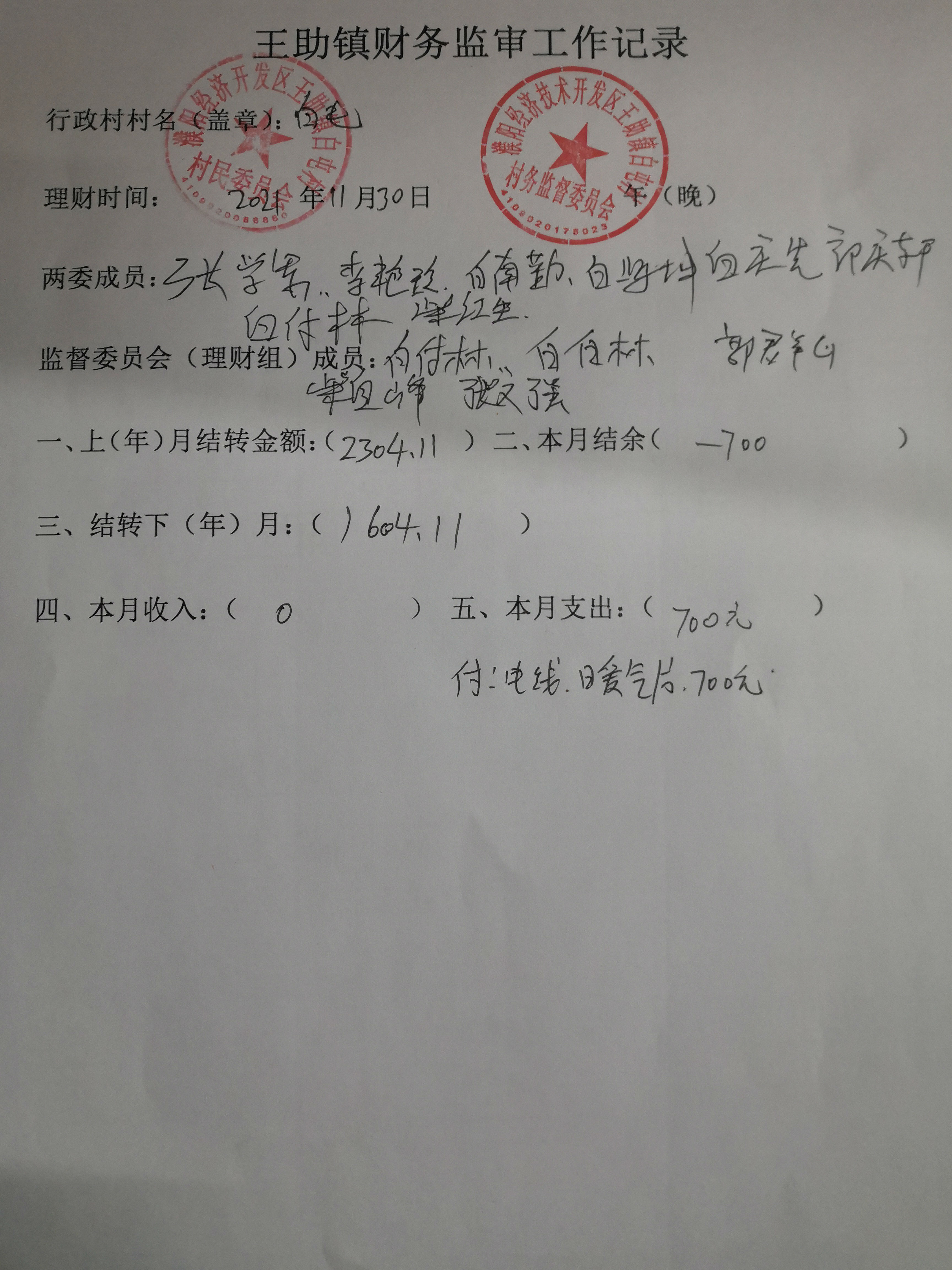 王助镇白屯村2021年11月份财务公开