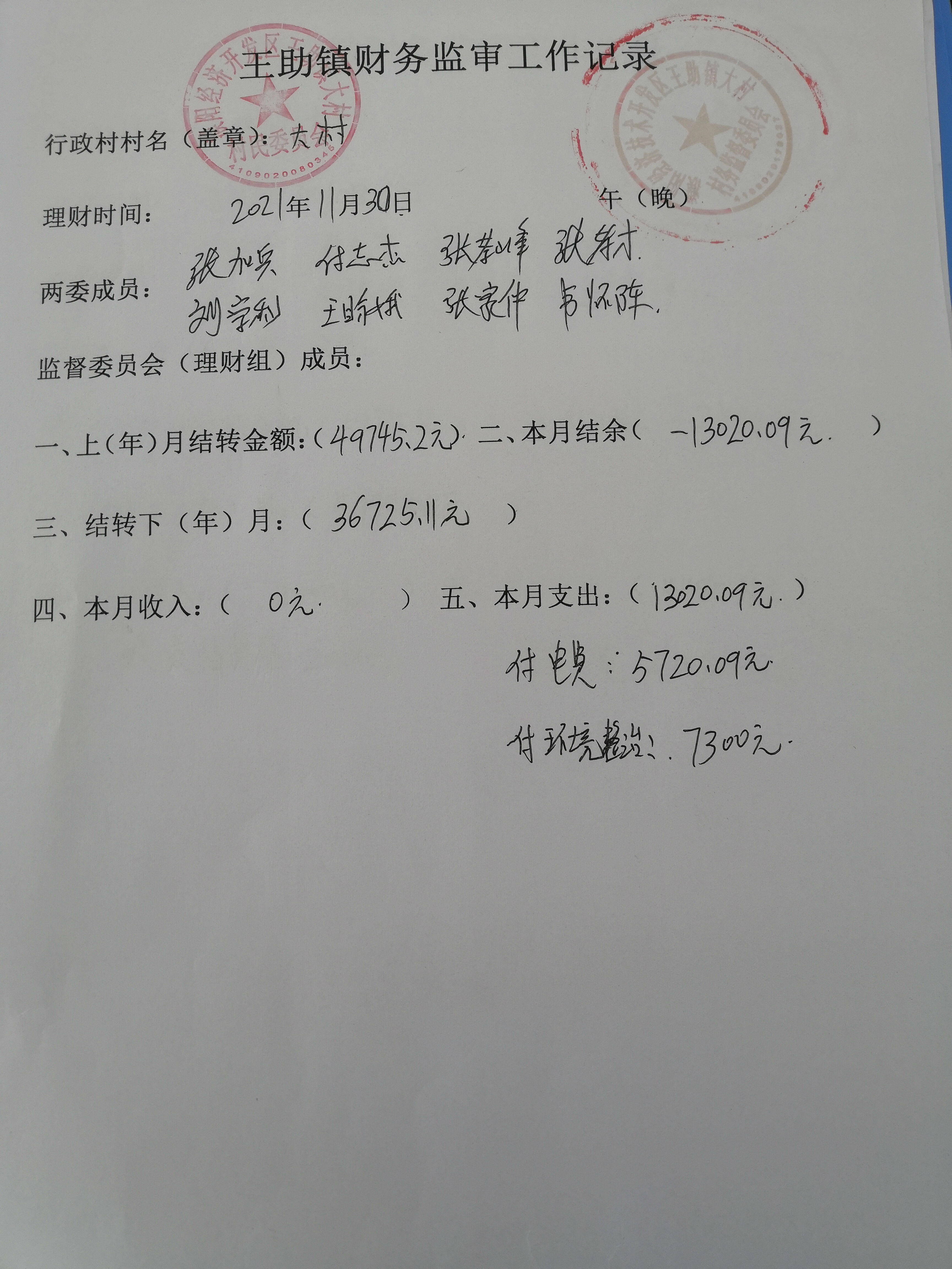 王助镇大村2021年11月份财务公开