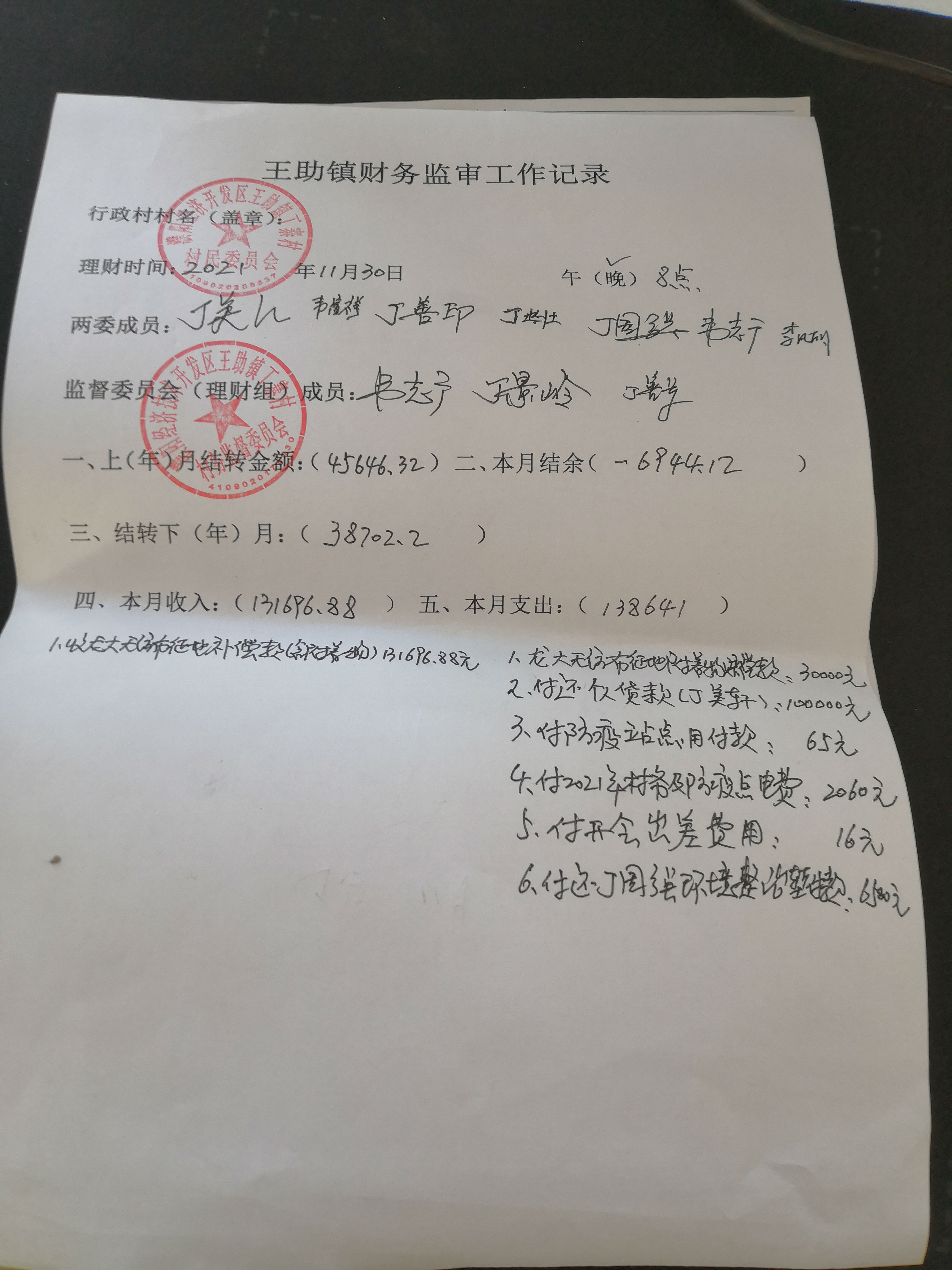 王助镇丁寨村2021年11月份财务公开