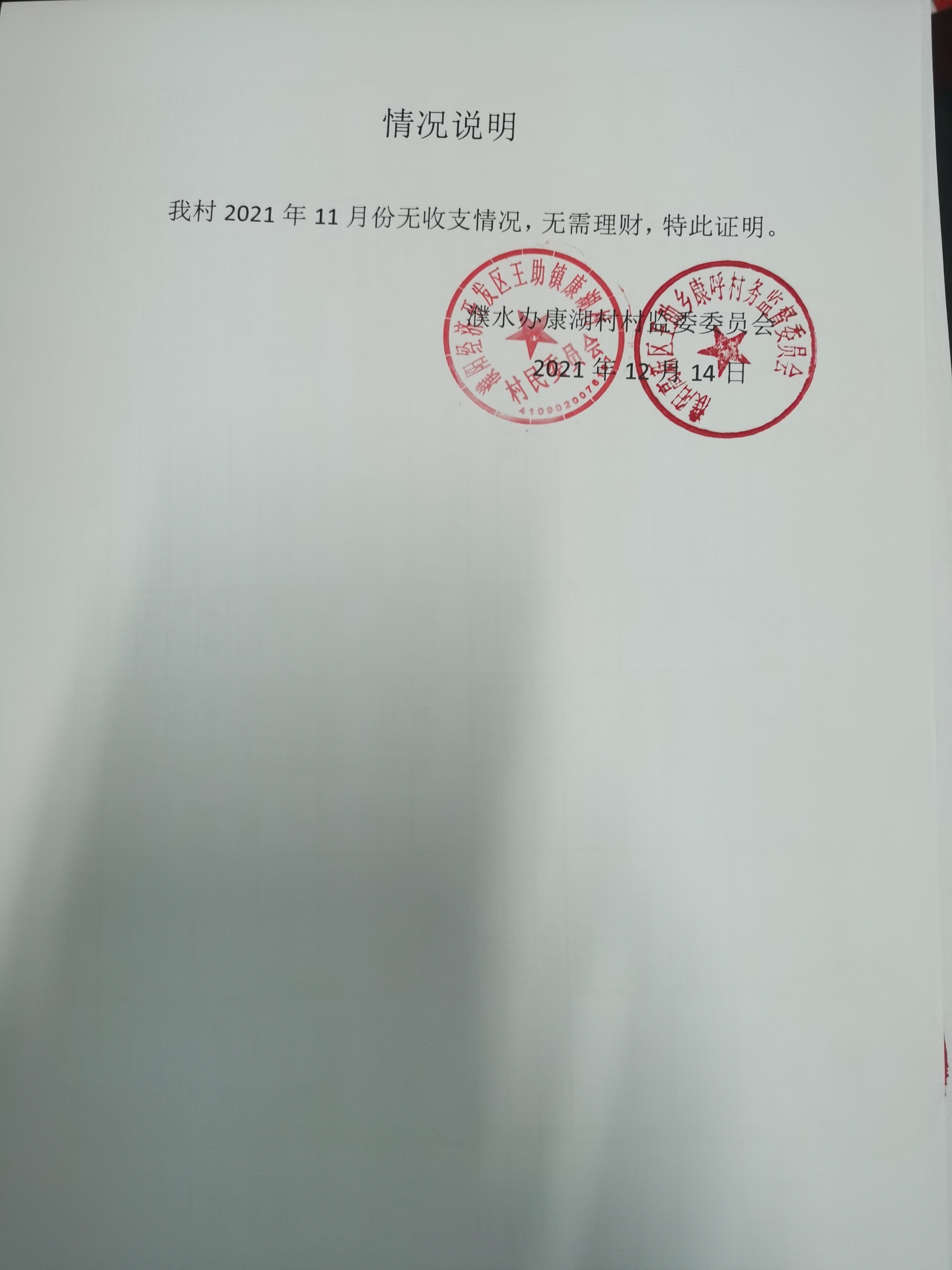 2021年康湖村11月份无收支情况说明