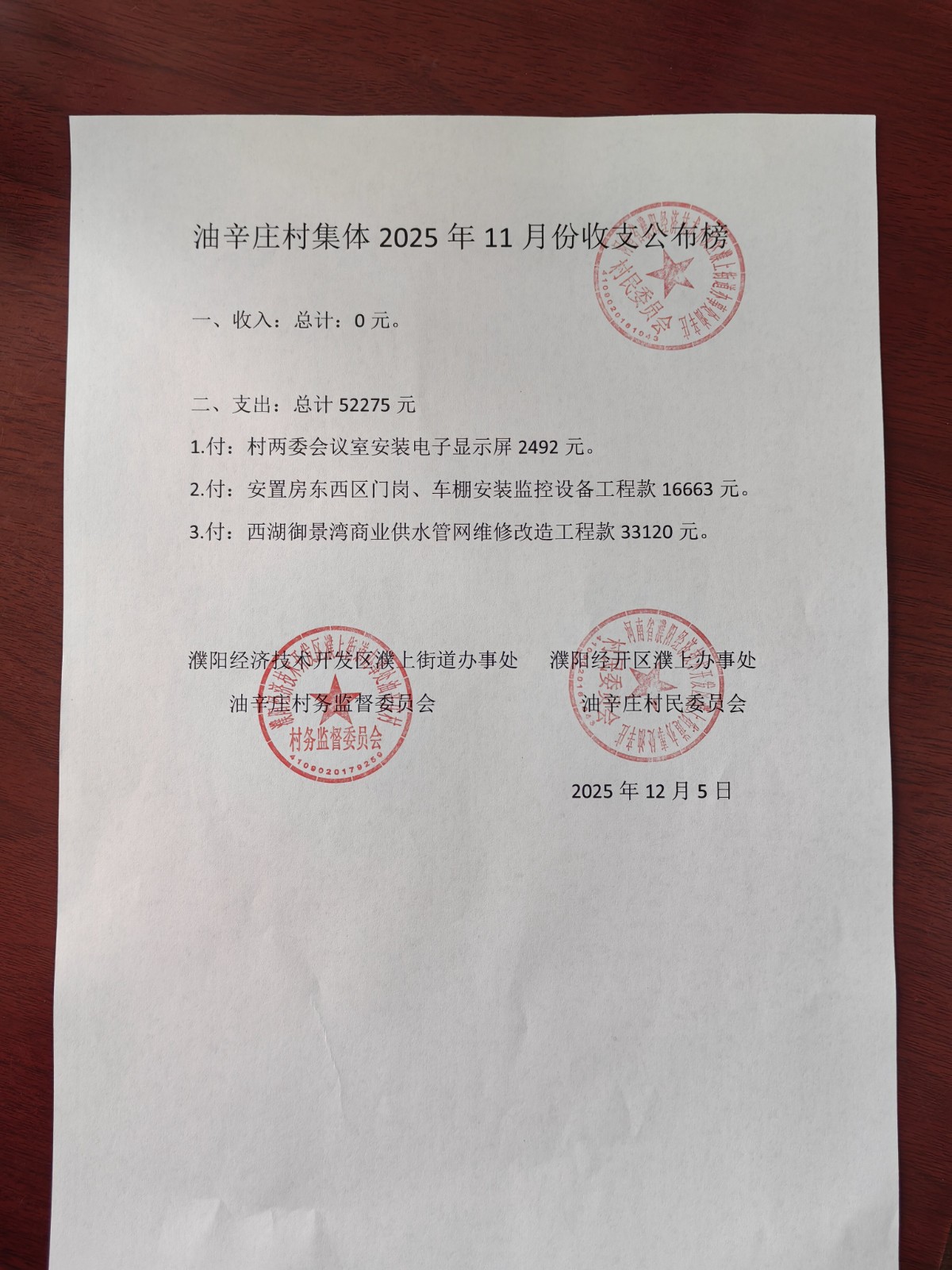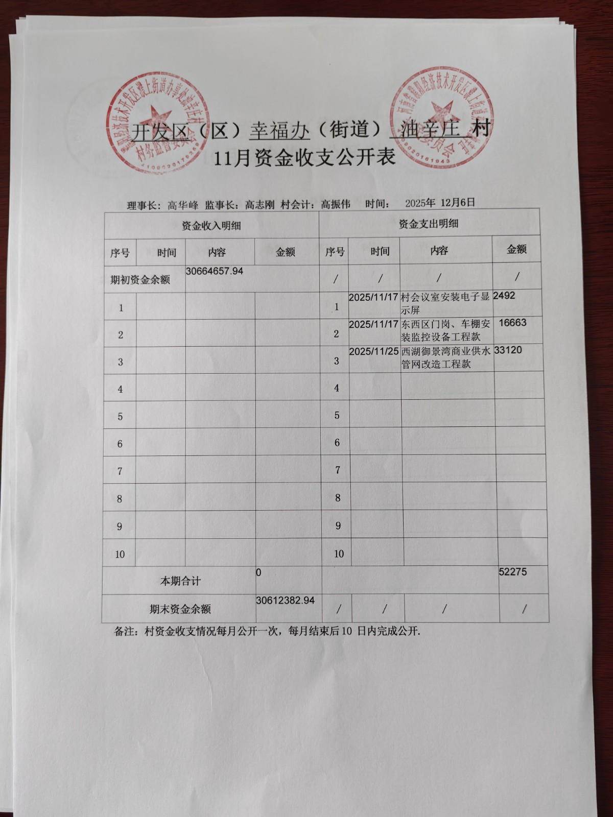 幸福办油辛庄2025年11月份财务公开